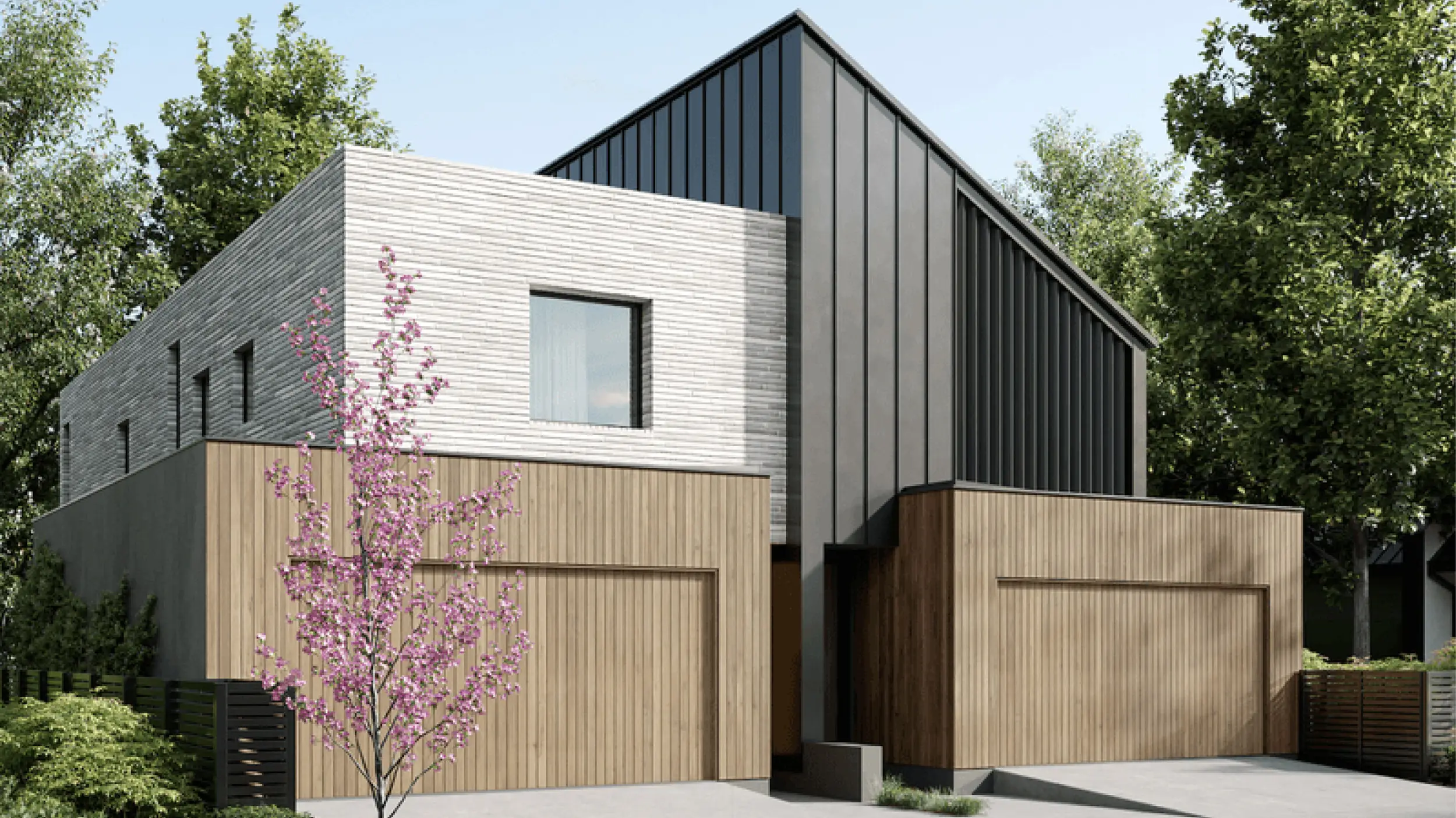 Spanning two levels of generously proportioned living space and featuring a double garage, these homes seamlessly blend vibrant entertainment areas with tranquil retreats. The central open-plan living area basks in sunlight, thanks to its remarkable north-facing orientation. Here, you'll find a contemporary kitchen adorned with high-spec appliances, a striking concrete or brick feature wall stretching the entire length of the building, and sleek bespoke cabinetry.